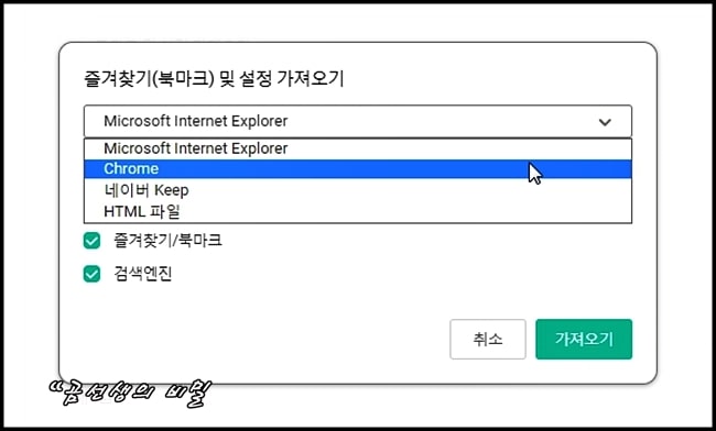 크롬을 선택하고 '즐겨찾기/북마크'를 체크한 다음.. '가져오기' 버튼을 누르세요.