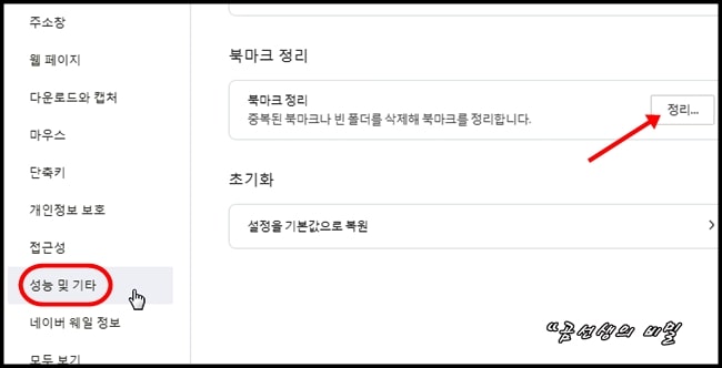 중복된 북마크를 정리하려면.. 우선 네이버 웨일의 설정 화면을 오픈하세요. 그리고 좌측 사이드바 메뉴에서 '성능 및 기타'로 들어갑니다. '북마크 정리' 메뉴가 보이시죠?