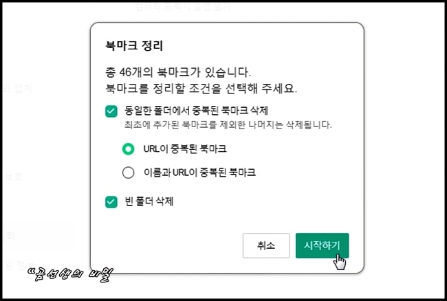 빈 폴더를 비롯해서 '동일한 폴더에서 중복된 북마크 삭제'를 체크한 다음 '시작하기' 버튼을 누르면, 중복되어 지저분해 보이던 북마크가 모두 깔끔하게 정리됩니다. 참고하세요~
